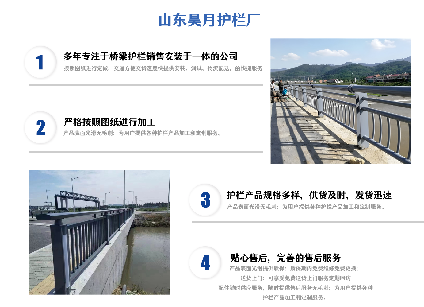 山東昊月金屬制品有限公司坐落于原材料豐富人文和諧交通發(fā)達及有“江北水城”之稱——聊城。 公司以科技興廠為宗旨,積極引進人才和技術,不斷開拓創新. 主營產品:SS級橋梁防撞護欄,不銹鋼復合管護欄,鋁合金護欄,燈光護欄,河道護欄等等。產品本公司建立了一套科學的行之有效的質量體系,擁有一支高技術、高素質團隊,堅持以“誠信”為本,堅持“優(yōu)質的質量、貼心的服務”為崇高理念,為用戶提供質優(yōu)價廉的產品提供至真至誠的服務。與客戶合作雙贏、攜手共創輝煌?! 」疽钥茖W的工藝、嚴格的質量管理、完善的服務理念、合理的銷售價格贏得了良好的聲譽,建立了密切和愉快的合作關系。多年來,我們一直以良好的品質、合理的價格,完善的質量保障體系,完善的售后服務為客戶提供周到的服務,滿足廣大客戶的需求。 我們以信譽求生存,以質量去競爭,以真誠換合作,以效益求發(fā)展,是我們的服務宗旨。我們積極主動與同行加強交流與時俱進,邁向新的歷程!我們竭誠歡迎您的咨詢和洽談,愿與同行業的同胞們合作共贏。...